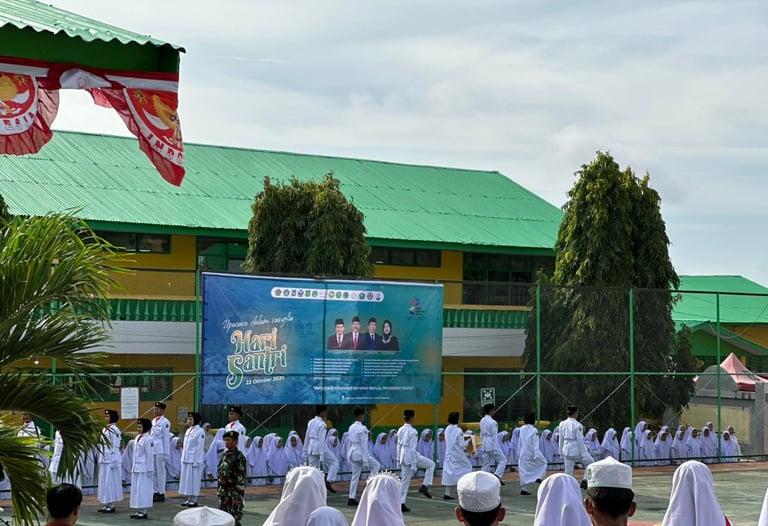 Apel Hari Santri Nasional tahun ini berlangsung dengan khidmat dan penuh semangat kebangsaan, dihadiri oleh unsur Forkopimda Kabupaten Soppeng, antara lain Ketua DPRD Kabupaten Soppeng, Kepala Kejaksaan Negeri, Kapolres, dan Dandim 1423/Soppeng, serta para pimpinan pondok pesantren dan santri. (afr)